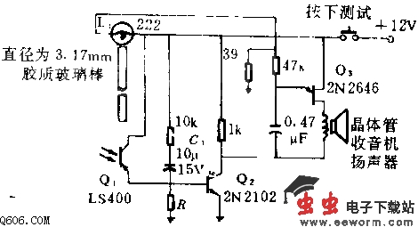 本电路能使驾驶员在司机座位上就能检查曲轴箱的油量,传感器包括一根装在油尺上的光导胶质玻璃棒,棒的顶端有一个灯泡L1.在油尺的加油标志处装着一个光电晶体管Q1,其位置大约比棒的下端低1.27cm(0.5英寸)。当油量正常时,Q1和棒的下端之间的光线受到油的衰减,使得光电晶体管的电阻值很大。如果掀下测试开关,使得C1充电。Q2在足够长的时间内维持饱和,就可以使单结晶体管Q3振动,从而扬声器短暂发出声音,说明探测器工作正常。当油量高度很低时,就有足够的光线达到Q1,使得在C1已经充完电之后Q2仍能维持饱和状态。这时,只要开关掀下,扬声器的声音就会响个不停。