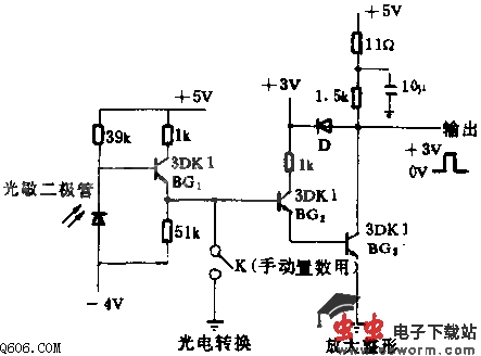 无光照时,暗电流很小,BG1基极电位为正。这里,BG1,BG2,BG3都导通,输出低电平。