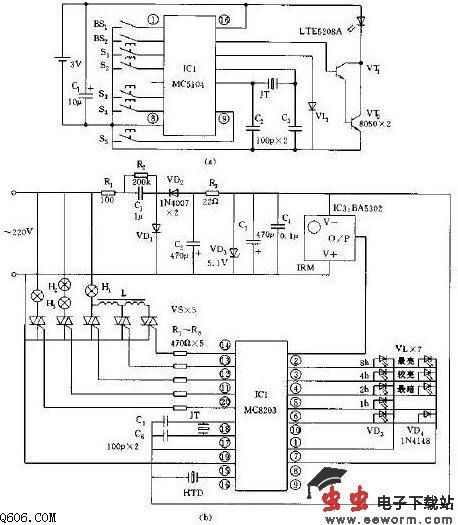 接收控制器的电路如图b所示,它是由电源电路、红外线信号接收放大电路、主控电路、驱动电路以及显示电路等构成。整机用交流市电电压经变换成5V直流电压供电,BA5302(IC3)是红外线信号接收、放大专用组件,从其O/P端输出的信号是经过处理后的解调电信号,然后进入到主控集成电路IC2 2脚中,对其进行处理分配,控制各电路工作。