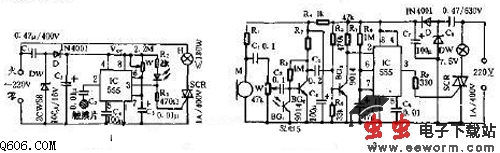 如图1所示,IC接成单稳态电路。平时IC处于复位状态,3脚为低电平,SCR截止,H灯熄。当人手触及金属触摸片时,感应信号触发IC使其状态翻转,3脚高电平使SCR导通,H灯亮。电容器C5原来在IC复位状态时放电完毕,现在IC置位,C5经W充电,当充电电压达到2/3Vcc时,IC复位,3脚低电平,SCR关断,H灯熄。电容器C5的充电时间也是维持灯亮的时间。这段延时时间为t4=1.1RwC5.图示参数最长时间约7分钟,调节W可改变亮灯时间。
