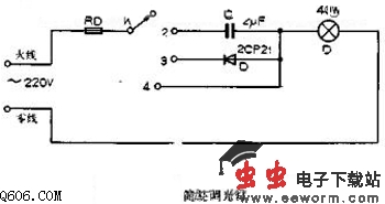 图中是一种简易调光灯线路,光线的调节由多档开关K控制。当K拨到“1”时灯灭;当K拨到“2”时,灯通过电容连接发出微光;当K拨到“3”时,电源经二极管半波整流给灯泡供电,灯泡亮度约为平时的一半;当K拨到“4”时,灯泡在额定电压下工作,亮度最亮。