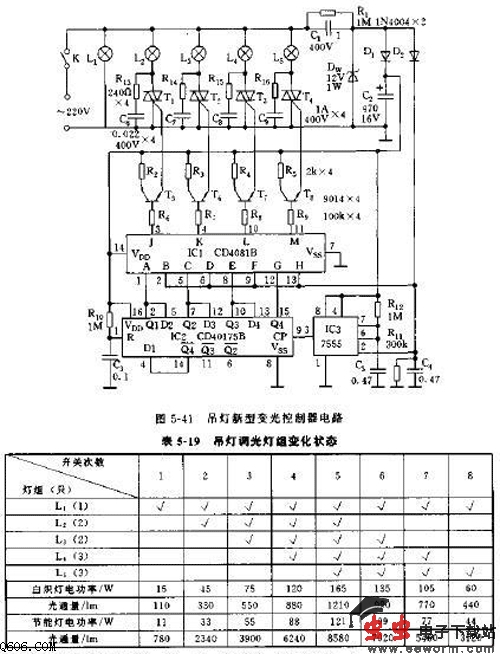 电路原理:1、调光原理是把吊灯的所有灯分为若干组。图中分为5组(L1~L6),其中L2只接一只灯且不会控制电路的控制,即开关K-接通,它就点亮。其余4组每组可接一只灯或多只灯(并联)。由数字电路四D触发器IC2控制,开关K每接通一次,灯被点亮的只数变化一次,所以可以调光。现已装有11只灯的吊灯(白炽灯每只15W,节能灯每只11W)为例,说明开关K开启的次数与灯被点亮的数量、电功率消耗及光通量对应关系,见图表。