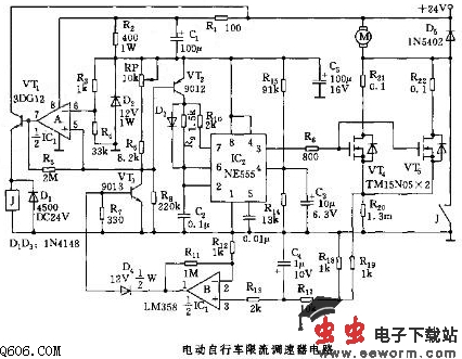 电流取样电路由1/2IC1(LM358)运放和VT3等组成。电流信号从功率管与R20的接点处取样,经滤波、放大,加至VT3.当过流时,VT3管降压减小,流过VT2的电流加大,从而改变C2的充电速率,使555振荡的占空比发生变化,达到限流和调速的目的。555和VT2、R9、R10、C5