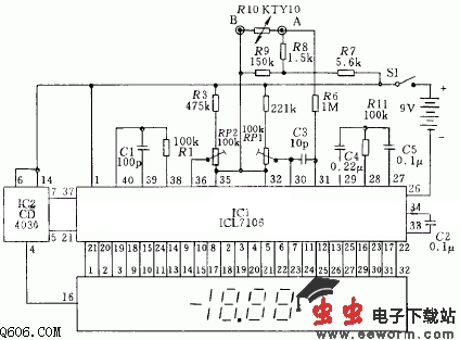 图中示出由液晶显示的温度表电路。温度传感器KTY10具有良好的温度-电阻之间的线性关系,与测量显示电路连接的点A、B可以用长达100m的导线连接,数字显示最大范围从-50度到+150度,显示位数为3又1/2.