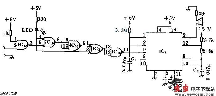 NE556定时器电路由IC3连接成振荡器,并由IC1(SN74132N)和IC2(SN7486N)进行控制。它能用音响振告数字逻辑被测点的静态状态,这为盲人实验人员提供了方便。当发生从1到0或从0到1的逻辑跃变时,只要持续时间超过50ns,这个电路便能够检测出来,并且以“嘟嘟”声发出报告。发光二极管供肉眼观测之用,当输入为逻辑1时,发光二极管发光。