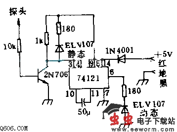 “静态”LED指示探头测试端的逻辑电平,“动态”LED发光表明探头测试端出现了一个正脉冲或“1”脉冲。即使脉冲出现时间很短暂,但由于本电路把脉冲宽度拉长到约50ns,因而仍可看出LED发光。脉冲扩展器要求输入脉冲起码是100ns,4V.1N4001二极管用来预防电源线接反而造成电路损坏。