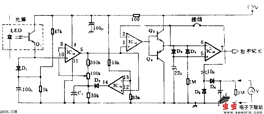本电路主要由光棒和四运算放大器IC1组成。IC1为放大器,利用硅二极管的指数式正向导电特性,把光棒的输出变换成对数式的变化电压,其峰-峰值正比于白、黑光电流之比,而与绝对值无关。IC1b为比较器,和峰值检测器D2-C1一起把放大器IC1n的输出箝到固定电位。于是,放大和箝位后的信号变换成微处理器需要的二进制数字式输出。输出是与TTL兼容的。