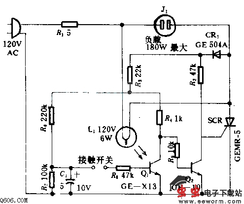 整流二极管GE504A将交流电变成直流供Q1、Q2.当人的手接触网状电极时,接通Q1基极电路,则Q1导通,Q2截止,在交流电源正半周时,SCR导通,180W灯泡点亮,L1 6W的小灯泡也点亮,L1照射Q1,维持Q1导通,Q2截止,虽然手已离开电极,灯泡仍亮。