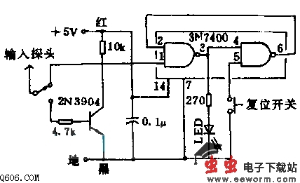 如果极性开关拨在如图所示的位置,那么,当输入探头接收到低电平(负向)脉冲时,光发二极管亮,并一直维持到电路被复位为止。如果开关拨到另一个位置,当有高电平或正5V输入脉冲时,LED也亮。