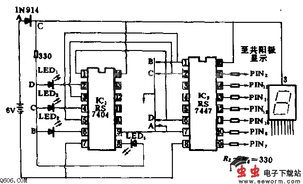 RS7447 BCD码至7段译码器可提供7段共阳极数字显示。由RS7404六反相器和4个LED构成的二进制输入指示器表示了输入端以2进制形式表示10进制数0~9;适于教学实验用。