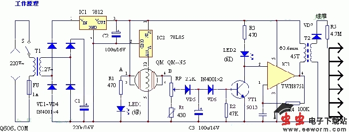 它的工作原理如图。电路分为两部分,以QM-N5为中心元件的电路组成空气检测开关电路,它可以检测可燃气体。当室内的有害气体达到一定浓度时,由于B点电位升高使VT1饱和导通,起到了检测开关的作用。Rt为负温度系数热敏电阻,用来补偿QM-N5由于温度变化引起的偏差。以TWH8751为中心器件的电路组成负氧离子发生器,其振荡频率约为1KHz,在T2次级可得到5kV左右的高压。放电端采用开放式,大大提高了负氧离子的浓度,减小了臭氧的浓度,使到达外面的负氧离子增加,TWH8751的2脚即同相输入端为高电位时,振荡器停振,在正常室内环境下,A、B之间电阻很大,B点电位很低,VT1截止,TWH8751的2脚为高电位,振荡器不工作,没有负离子产生;当室内的有害气体浓度超过了