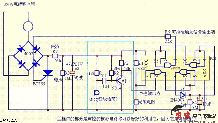 串接于电路中的受声控负载(感性:如节能灯,或阻性:如灯泡)由于串接特性所以此电路可以直接接于开关点上代替原开关。