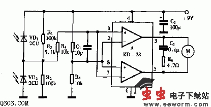 VD1、VD2是两只光敏二极管,当用手电筒照射VD1时,KD-28的1脚电平高于8脚,这时输出端3脚电平高于电源电压的一半,而输出端5脚电平低于电源电压的一半,玩具电动机M在正向电压下驱动正转,玩具车向前行驶;若用手电筒照射VD2,集成块1脚电平低于8脚,则输出端3脚电平低于电源电压的一半,5脚电平高于电源电压的一半,电动机M在反向电压下驱动反转,玩具车后退。本电路要求VD1与VD2尽可能采用特性一致的2CU型光敏电阻器。电动机M应采用工作电压比电源电压低2V左右的玩具小电机。电路安装好后应适当调整电阻R1、R2,要求电路在静止状态时电动机M应停转。