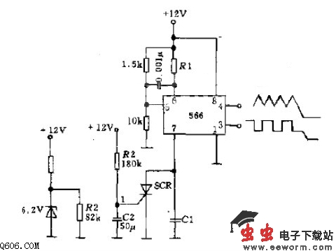 图中所示电路采用566压控振荡器集成电路,可产生持续时间为0.5s的脉冲串。脉冲频率为f=1/3R1C1.