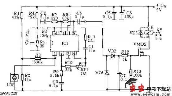图中示出高灵敏的接收器电路。从超声波话筒UW接收的信号经过集成电路NE542V放大约1000倍。其输出经二极管VD1和VD2整流成直流,最后通过VMOS晶体管控制继电器动作。VMOS晶体管输出电流可达2A.因此可以带动很大的负载,如电磁阀、大功率灯等。