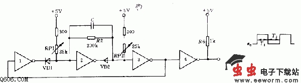 图中所示电路主要由四个“非”门组成。振荡信号频率由C和电位器RP1、RP2的参数决定。改变电位器的电阻值即可改变频率。频率调节范围可达20:1.电位器RP2的阻值决定输出波形T1的宽度,电位器RP2的阻值决定输出波形T2的宽度。