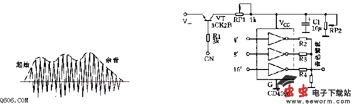 电路原理如图所示。图中CMOS反相器的三个输入端分别接到音乐输入端(4'、8'、16'音符端),输出经电阻相加后送音色滤波器,再经功放至扬声器发声。反相器的输入、输出信号都是方波信号,通过控制反相器的电源电压,即可控制输出方波的幅度,这到产生音形包络的目的。控制端CN由高电平为低电平时(对应于按下某一琴键),V+经三极管VT、电位器RP1对电容C1充电。Vcc逐渐上升到接近V+。使音乐信号的幅度从小逐渐变大,变化快慢可通过改变RP1、C1时间常数调节。放键时,CN端由低电平变为高电平,三极管VT截止,CMOS电路由电容C1继续供电,且幅度渐断降低,起到延长余音的作用,余音长短可由RP2调节。适当调节RP1、RP2,在CN点加上周期脉冲信号即可获得多种式样的音形,以表达各种音乐感情。将按键信号与一个几赫兹的正弦波相减后控制CN点,即可得到如图所示。