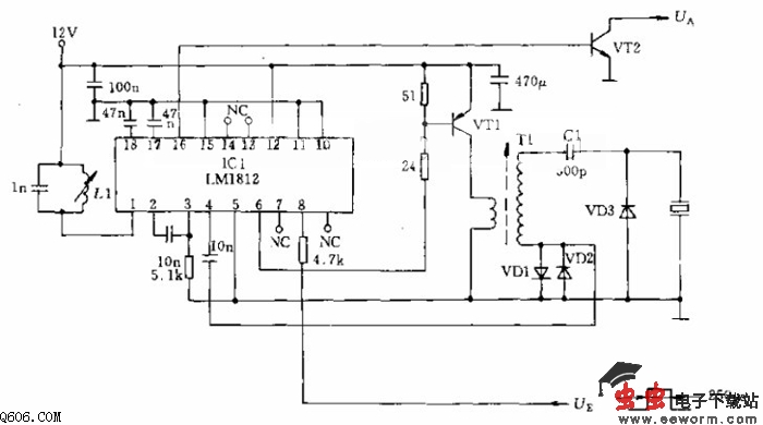 图中所示电路可以测量100mm~3m距离。该电路采用LM1812专用集成芯片。变压器T1的次级绕组与500pF电容C1谐振在50~60kHz的频率上。同时将L1也调谐在这个频率上。从示波器上可以观察引脚1上出现的最大回波灵敏度。升压变压器T1可为变换器提供150V的偏压。