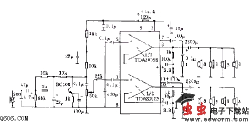 图中采用TDA2005S双低频功率放大集成电路的公共汽车收音和扩音电路。图中输入端可以接话筒或收音机的低频电压放大输出级。每个TDA2005S输出10W功率,可带4个扬声器。两路输出可带8个扬声器,可分放在车内不同地点。总共输出功率可达20W.