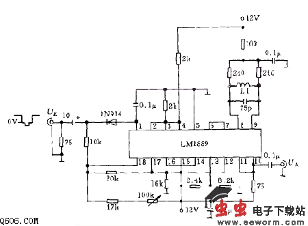 如图电路,在这里输入信号Ue为试验信号,在输出信号Ua为调制信号,100k欧电位器用来调节调制深度。