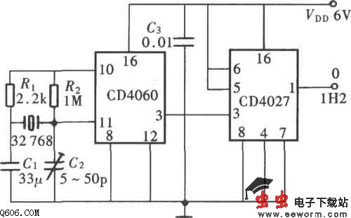 CD4060、CD4027制作的1Hz时钟信号源电路图