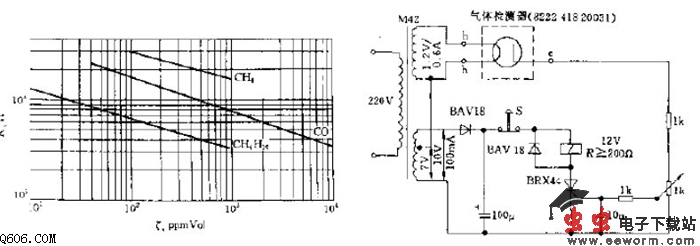 图a示出典型的传感器电阻R同气体浓度p的关系曲线。按上述原理构成型号为822418200031的气体传感器,它由一个毫米大小的陶瓷片及加热灯丝和相对的电极所组成,工作温度为300度,其上通过直流或交流电流。