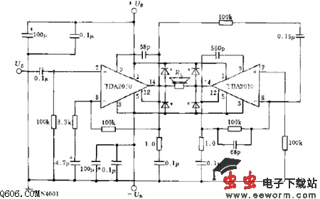 图中所示,采用TDA2010构成的桥式高保真电路,供电电压正负Un=正负17V,带R1=8欧负载,输出功率可达30W,畸变系数《1%。同样的电路,如采用TDA2020,由正负14V供电,输出功率可达24W。