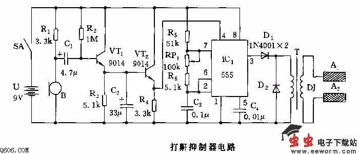 555打鼾抑制器电路图 打鼾会影响他人的休息,也不利自身的健康。图中是一种打鼾抑制器的电路图。它由鼾声收听放大电路、监测控制电路和刺激电极等三部分组成。