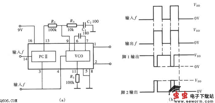 频率信号跟踪电路即锁相环电路,它是CD4046的基本应用电路之一。如图所示为用CD4046组成的能够捕捉和跟踪频率为l00~100kHz输入信号的锁相环电路。