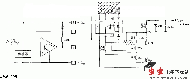 集成电路LM3911是由运算放大器及稳压电路构成的硅片传感器。只需外接少量元件就可构成一个简单的电子温度表。硅片中利用晶体管作温度敏感元件。晶体管基射极电压随温度变化而变化。当温度升高时,基射极电压也升高。从一块铜块上摄取的外界温度传递到温度传感器上,铜块接到集成电路的引脚5~8上。这些引脚在内部连接到温度传感器上。温度传感器恒压源(6.8V)供电。