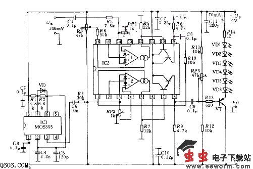 图中示出伴音用的红外发送电路,适于在无线电调谐选台、高保真放大器及录音机中作高灵敏度伴音电器。采用两级跨导运算放大器(OTA)作调制器组件。电路中低频信号uk经过电容C1加到OTA1输入端,放大约2倍。利用电位器RP可以在宽范围内改变OTA1的控制电流,并从而改变放大系数和调制度。调制信号通过C6加到OTA2上,由IC1(555电路)产生载波振荡信号(频率约为38kHz)以低频信号的节奏进行幅镇调制。已被幅值调制的载波信号再通过C9加到达林顿功率晶体管VT上,并由6个红外发射发光二极管VD1~VD6发射出红外信号,经红外接收电路所接收。