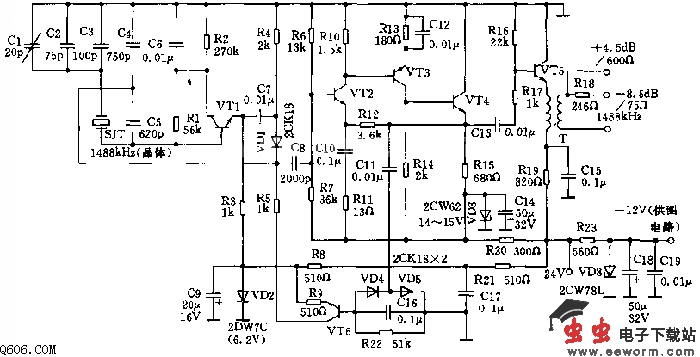 l488kHz主振器如图所示。三极管VT1、二极管VD1、电容器C1~C7及相关元件组成一个电容三点式振荡电路。振荡电压由三极管VT2~VT5及相关元件组成的放大器加以放大。其中,VT4为射极输出器,它的特点为输入阻抗高、输出阻抗低,使后级带负载能力增强,对前级的振荡信号起到稳定作用。放大后由变量器T输出l488kHz信号频率。