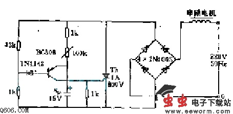 该电路用于串励电动机调速用,晶闸管放在整流二极管桥的一个对角线上,因此通过改变直流通路上晶闸管Th的导通脚即可调节桥另一个对角线上的交流导通角,从而改变加在负载上的交流电压。在图中左部由电阻、电容构成的桥式电路对角线处接晶体管基射极,它决定晶闸管的触发时刻。此电路由于有电容,故右半部桥分支上的电压总是落后于左半部桥分支上的电压,改变100k电位器即可改变相位差,实现移相控制。