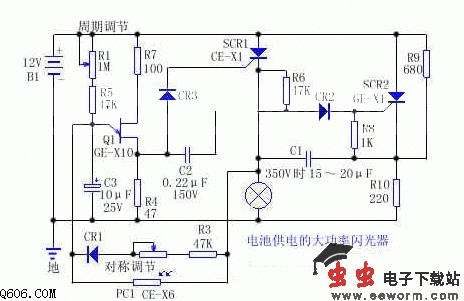 这一闪光器由一个12V汽车或汽艇电池供电。它提供36~40W输出和可变的闪光频率(高达60次/min),并能实现独立的通断周期控制和光电昼夜控制,使闪光器自动地在夜间通电,在白天断电。SCR1和SCR2组成一个基本的直流触发器。灯负载接到一个可控硅整流器(SCR)的阴极引出线,以便灯的另一端可以处在地(负)电位(这在某种场合是需要的)。触以器定时由一个普通的单结晶体管振荡器电路(Q1、R1、C3等)来控制。电位器R2和二极管CR1可单独控制通/断定时。光敏电阻在白天切断单结晶体管起动电路。闪光灯泡为12V、3A。