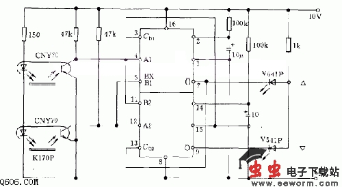 如图,电路示出利用光导发光元件CNY70检测位移的一种方案。被检测元件为两块可反射光的平板。指示元件分别为两个发光二极管。