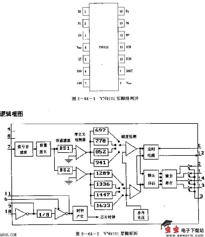 YN9101是双音多频信号接收集成电路,也适用于通用遥控接收电路。内部电路由拨号音滤波电路、前置放大电路、带通滤波器、零交叉检测器、幅度检测器、定时电路、时钟产生电路、输出译码电路和输出寄存器等组成。