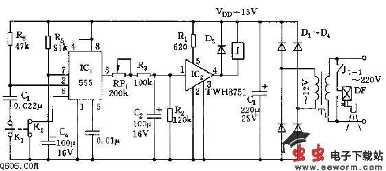 K为便池蹲位开关,当人离开蹲位板时,K1接通,K2断开,2脚瞬间呈低电平,使555置位,3脚呈高电平,对C2充电,当IC2的1脚电位大于TWH8751开关管D5的开启阀值电平时,IC2导通,J吸合,常开触点J1-1闭合,电磁水阀DF得电开启放水。放水时间由C2经R2放电时间常数决定,当1脚电压低于开启电平时截止,约为10秒左右。