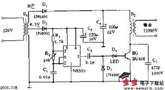 电路原理:此电路的核心元件是NE555时基电路,它可产生出15~20kHz的高频振荡信号,高频可由R2调整。驱动信号由其第3脚输出,经C3、D1、LED组成的分电路后,使大功率管BG工作在丙类状态。驱动信号的强度可根据LED亮度直接观察出来,由其驱动功率管的导通和截止,使流过升压变压器B2初级线圈的电流发生大小变化,进而在B2次极产生出高频高压电流,以供霓虹灯管工作。调整R2可使输出电压最高。接在BG集电极与地之间的电容C5不能省去或开路,以防由B2产生的反峰电压击穿BG,一般情况下,本电路输出的功率可驱动3~6m的霓虹灯管发光。