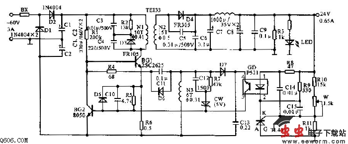 为了减小输出纹波,在该电路的输入端采用全波倍压整流,用提高直流电压的方法来降低输出纹波。实践证明,可取得满意的效果。如果用通常的方法,将交流60V经桥式整流,那么要得到同样低的输出纹波,输入滤波至少用5只470u/160V的电容。该电路的主要技术指标如下:输入交流电压35~70V,输出直流电压24V,输出直流电流0.65A,输出纹波(满负载时)<15mV(Vp-p).