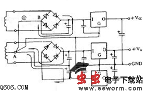 如图是多路输出电源电路,输出+Vcc和正负Va三种电压。电路中A点是正负电源的基准地接点,B点是单正电源的基准地接点,(1)是基准电位间的接地线,(2)是稳压器的基准地线。