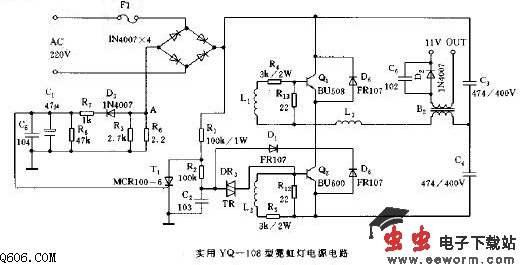 如图所示是带过压保护实用YQ-108型霓虹灯电源电路。它采用全塑封,环氧树脂浇灌工艺,寿命大大提高,还具有效率高、省电、功率因数高、易于安装等特点。