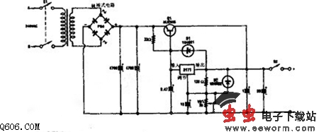 电路中的变压器产生一个额定6A,18V的次级电压,这个电压被送到桥式整流器和两个4700uF的电容以产生一个25V左右的直流电压,此电压被输送到M32955晶体管的发射器,并且通过一个33欧的电阻送至LM317T的输入端。