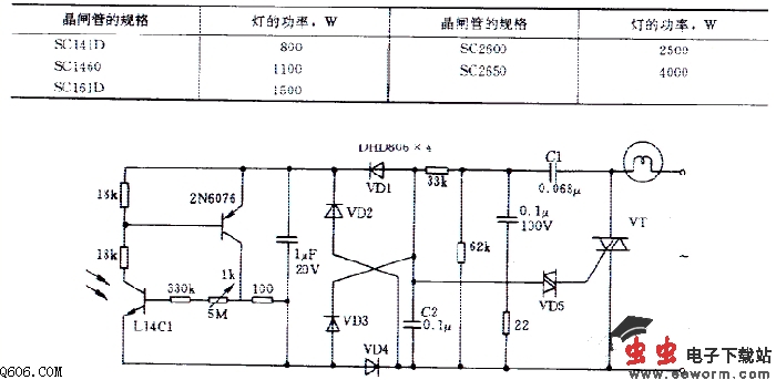 如图所示电路采用光敏三极管作为照度传感元件。当白天照度很大时,光敏三极管L14C1导通。二极管VD3也导通,使电容C2上压降为零,双向触发管VD5和双向晶闸管VT均不导通,灯不亮。反之,夜间L14C1不导通,C2上有电压使ST4和VT导通,灯自动会亮。