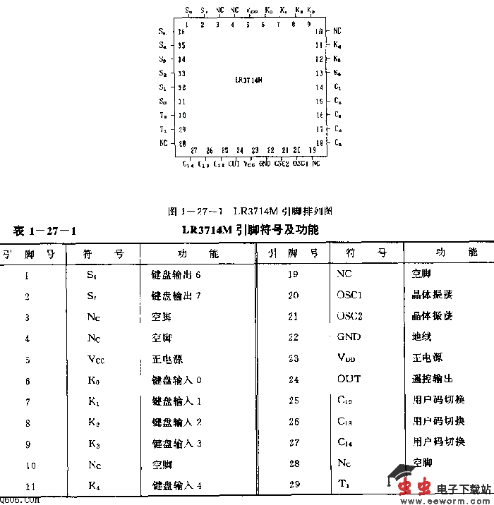 LR3714M是红外线遥控发射集成电路,适用于录像机等。内部电路由键盘输入编码电路、振荡器、分频器、扫描信号切换电路、调制器、数据数控制电路、数据反转电路、并/串变换电路和键脉冲输出电路等组成。