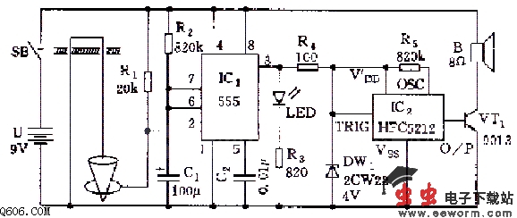 IC2采用语言集成电路HFC5212,它内存有“嘟嘟,请注意”的语言信号,采用电平、不保持触发方式。它的最高工作电压不高于5V,为此,电路中采用R4、DW1稳压方式,由2CW22提供+4V的电压。R5为其振荡电阻,改变它的阻值大小,可改变语言的音调。HFC5212的触发端TRIG接在Vdd上,这样一来,一旦IC2输出高电位,即迅即被触发发声,一直发声1.5分钟。它输出的语音信号经VT1放大,驱动喇叭发出“嘟嘟,请注意”的告诫语句,提高防范意识。在IC1输出高电位期间,发光二极管LED点亮发光。