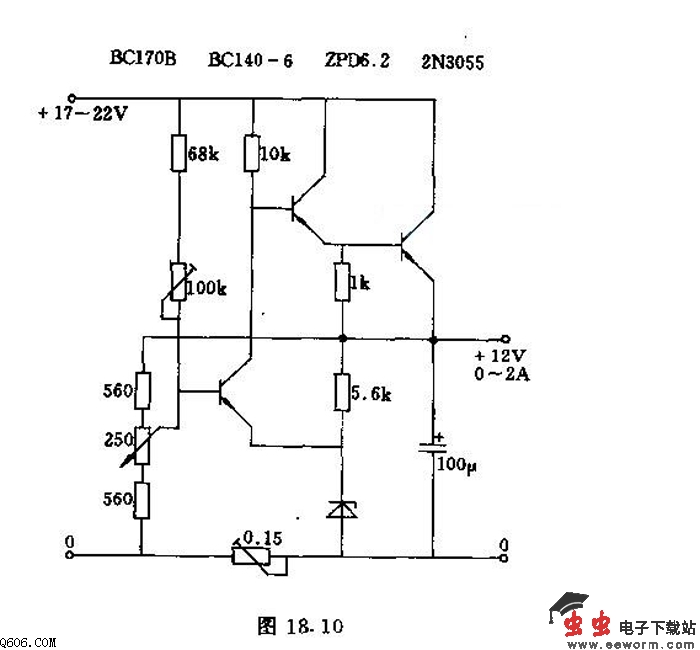 该电路将给定值与实际值电压之差放大,放大系数可以调节。它有较高的稳压系数和较小的输出电阻。在输出晶体管2N3055上装有散热板,其热阻<5grd/W,BC140也必须安装散热器。