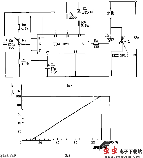 该电路可以控制1~2kW的输出功率。负载可以是电饭锅等。调节电位器Rp(47M欧)可以使输出功率自0至100%改变。电容Ct用于调节工作时间,图(a)中Ct=47uF,对应的最短时间为15s。电阻R1和R2的选择要能保证有足够的功率调节范围。输出功率P与调整范围(均用百分数表示)之间的关系如图(b)所示。