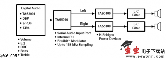 TI公司的真正数字功放(TDAA)由TAS5010 PCM-PWM调制器和TAS5100数字功放组成。该系统接受串行PCM数字音频流并变换成3.3V PWM音频流,然后放大成大信号PWM,再经解调后驱动扬声器。TAS5010是基于Equibit技术创新的、高性能、经济实用的24位立体声PCM-PWM调制器。该器件有多种串行输入格式选择:包括左对齐、右对齐、IIS或DSP数据格式,并与AES标准取样速率完全兼容,还可提供去加重功能。5010内部还有一个数字内插滤波器,将音频数据以2倍、4倍或8倍(取决于取样速率)上取样至352.8KHz或384KHz,这个速率就是 TDAA内部取样速率。Equibit调制器则将上取样信号变换为同频率PWM信号,调制器采用完善的专利校正算法来补偿非线性,提高系统的整体性能。 TAS5100是单通道PWM功率音频器件,它由集成栅驱动器、4个匹配的又电气上隔离的增强型N沟功率DMOS晶体管组成,内置保护电路和故障告知电路。由上述二个器件组成的TDAA系统的动态范围大于93dB;TDH小于0.08%(1KHz、6Ω负载、1W~30W RMS);在8Ω负载上的功率效率大于90%。