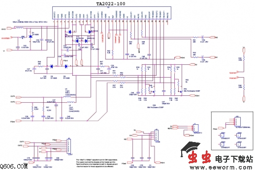 TA2022 是Tripath生产的模拟输入立体声集成化调制器和输出级。它的与众不同之处在于,其调制器采用扩频开关模式,而不是固定的频率,因此公司称为“T类” 放大器。该器件在±25电源电压下,每个通道在8Ω负载上可输出25W功率,空闲损耗功率测得为3.4W。TA2022在25W时具有 0.015%THD;60W时上升为0.1%。它封装在SSIP-32塑料封装中,需外加散热器。