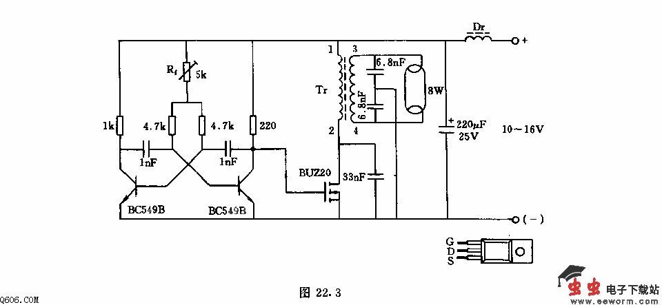 该电路采用SIPMOS晶体管,其优点是无需再接放大器控制电路,效率高,工作频率可到100kHz,电路的工作电压这里可取10-16V.开关晶体管BUZ20由多谐振荡器控制,其振频率由5k欧电位调整器。变压器采用铁氧体磁芯,初级绕组1-2匝与33nF电容构成串联谐振回路,在阻塞其间,场效应管漏极上约有60V电压。在接通其间内,这一回路由于正向电阻使振荡很快衰减,仅约电池电压的1-2倍。